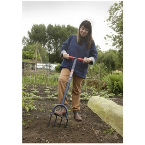 Labiofourche SPEAR & JACKSON – 4 dents – acier – 111 cm a la particularité, une fois enfoncée dans la terre, de ne pas la retourner et de laisser la première couche du sol avec ses micro-organismes : le sol n’est pas labouré mais seulement brisé et ameubli sur toute l’épaisseur travaillée. La biofourche agit de façon contraire à une bêche, au labour ou au motoculteur. En effet, ces outils »classiques » mélangent toute l’épaisseur du sol travaillé, la couche de surface, la plus riche en humus ayant besoin d’oxygène, se retrouve au fond, où il n’y a pas d’air et est donc asphyxiée, et celle du fond, la moins riche, se retrouve en surface.