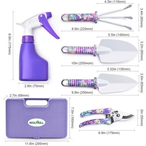 ELLE Outils De Jardinage 5 PCS Avec Transplantoirs Ciseaux Herse Anti-rouille Pulvérisateur Et Boîte (Violet)