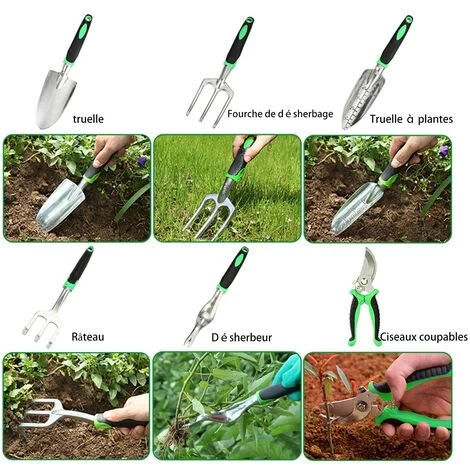 - ăSet Ensemble de jardinage de 9 piĂšcesă: Ensemble dâoutils de jardinage nouveaux et amĂ©liorĂ©s. Outils de jardinage de haute qualitĂ©. Parfait pour tous vos besoins de jardinage, y compris la taille, le creusement, lâameublissement du sol, lâaĂ©ration, la plantation, la transplantation, le dĂ©sherbage, etc.