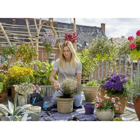 Avec la Pflanzmatte GARDENA L, le des plantes sur un balcon ou une terrasse d’une propre marchandise. Le tapis est simplement sur le sol calorifique. Tous les ustensiles de travail importants, tels que des pots de fleurs et fleur de la terre, y trouverez de la place et il peut être facilement des plantes et umgetopft sur le tapis. Le coussin de genou facilite votre travail, il ménage les genoux. La Pflanzmatte se compose d’un tissu imperméable, est facile à nettoyer et peut être pliée après utilisation peu encombrante. Ce texte a été traduit par une machine.