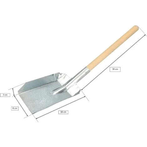 - Caractéristiques techniques – Matériau : tôle d’acier galvanisée – Surface : galvanisée – Poids : 239 g – Couleur : argent – Manche en bois – Tous les détails et dimensions sur le schéma (images)