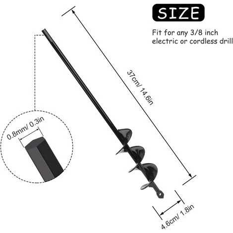 - ?Taille du foret en spirale? Ampoule de jardinière de 4,6 cm de diamètre x 37 cm de longueur (1,8 pouces x 14,6 pouces) avec entraînement hexagonal antidérapant de 0,8 cm / 0,3 pouces.