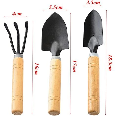 - La taille des ensemble outils jardinage: La taille de la pelle est de 17cm*5.5cm; 18.5cm*3.5cm; la taille du râteau est de 16cm*4cm.