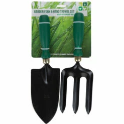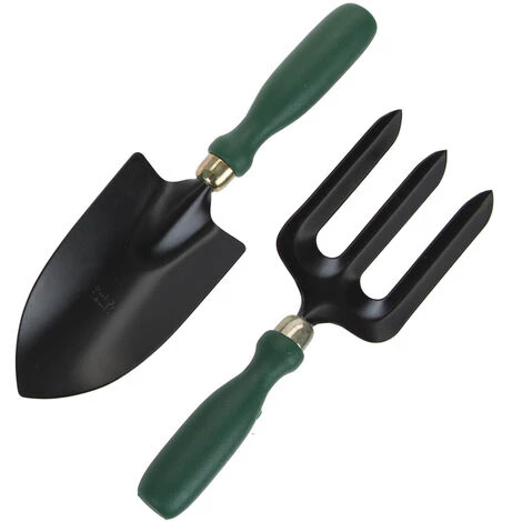 Ensemble râteau et bêche de jardin en fer forgé robuste avec des assistants verts, l’outil indispensable pour tout jardin et potager.