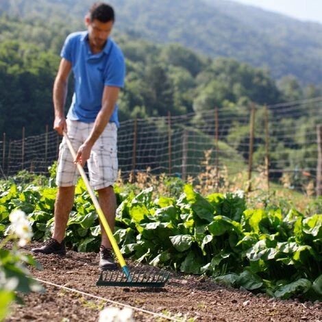 ° Pour ramasser les déchets, les feuilles, les cailloux, pour briser les mottes après bêchage, affiner la terre et niveler les sols, pour serrer les semis et buter les