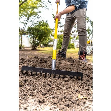 Ce râteau de la marque Suan bénéficie de 14 dents courbes permettant de briser les mottes après le bêchage, ainsi que d’affiner et niveler les sols.