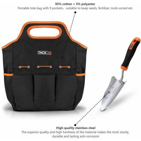 CE QUE VOUS OBTENEZ – Ensemble d’outils de jardin Tacklife GGT4A ; Comprend un sac fourre-tout et 6 outils à main avec un sécateur à contournement, une truelle, une truelle de transplantation, une pelle à sol, un désherbeur, un cultivateur ; Carte; 24mois