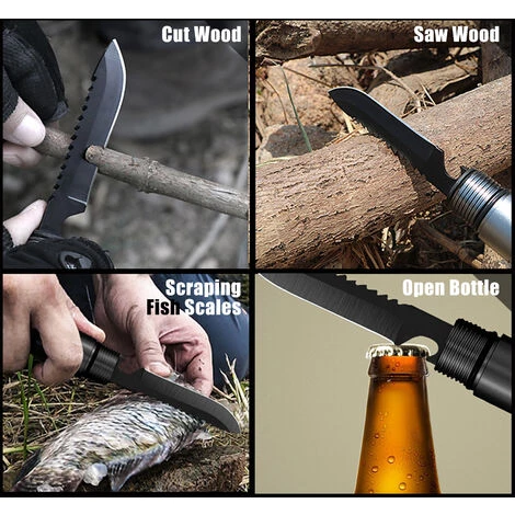 Caractéristiques :[Pliable] La pelle en acier inoxydable est une conception pliable, qui peut complètement économiser beaucoup d’espace.[Polyvalent] Il peut être utilisé comme marteau, scie, couteau et tournevis, creuser, scier, couper, cueillir, marteler, tire-bouchon ou pelle.[Facile à transporter] Petite taille pliable avec sac de rangement, il peut être mis dans un sac à dos, une voiture ou une boîte à outils.[Facile à saisir] La poignée est conçue avec un arc ergonomique et est confortable lorsqu’elle est tenue.[Utile] Le petit couteau peut éplucher les peaux d’animaux, détartrer les écailles de poisson et couper la corde. Un sifflet peut siffler ou facilement prendre feu.