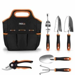 Contenu de l’emballage : 1x sécateur, 1x truelle à main, 1x truelle de transplantation, 1x pelle à sol, 1x râteau, 1x extracteur d’herbe, 1x sac en coton.
