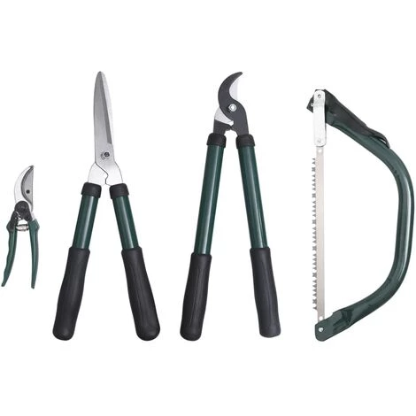 Cet ensemble comprend un sécateur à dérivation, une cisaille à haies, un élagueur à dérivation et une scie. Chaque outil de cet ensemble est fabriqué avec des lames en acier et des poignées confortables. Le sécateur à dérivation est utilisé pour la taille des brindilles et des petites branches. Il est généralement pour couper et enlever des branches entières. En outre, la cisaille à haies est utilisée pour tailler et façonner les haies et les buissons. Elle est conçue pour couper et tailler un certain nombre de petites branches en même temps. Avec l’élagueur à dérivation, les branches qui sont plus minces que les sécateurs peuvent être coupées facilement. La scie est adaptée à la coupe de grumes et de branches sur la course de poussée et de traction.